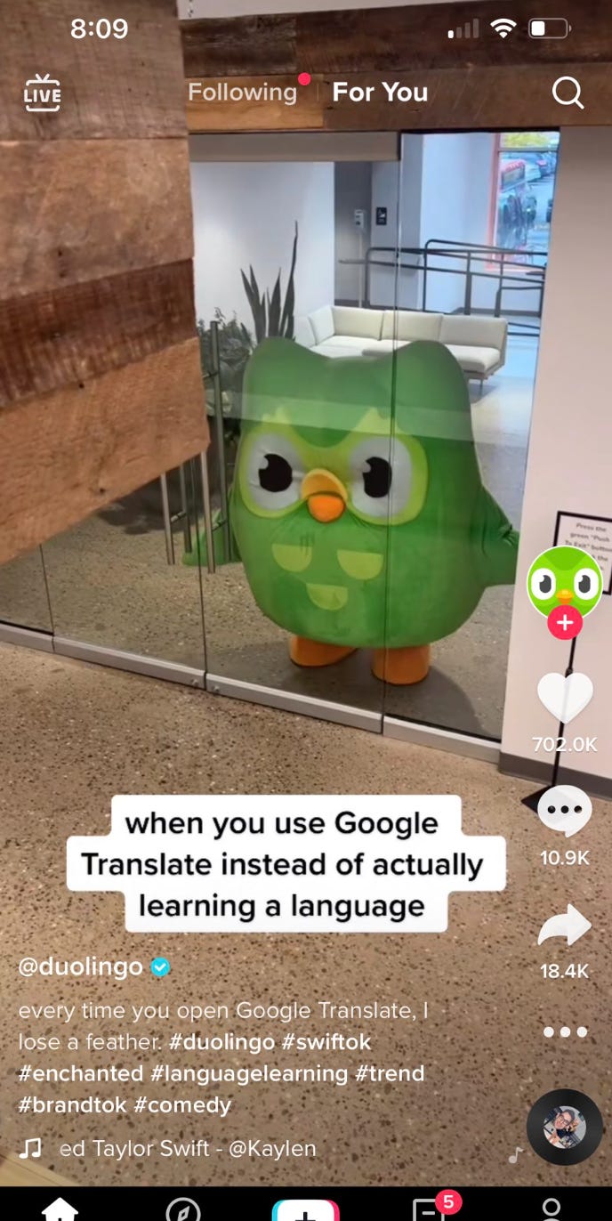 Duolingo’s giant green owl became a TikTok menace—dancing, staring blankly, and waddling into awkward moments. It was so cringe, it looped back around to charming.
