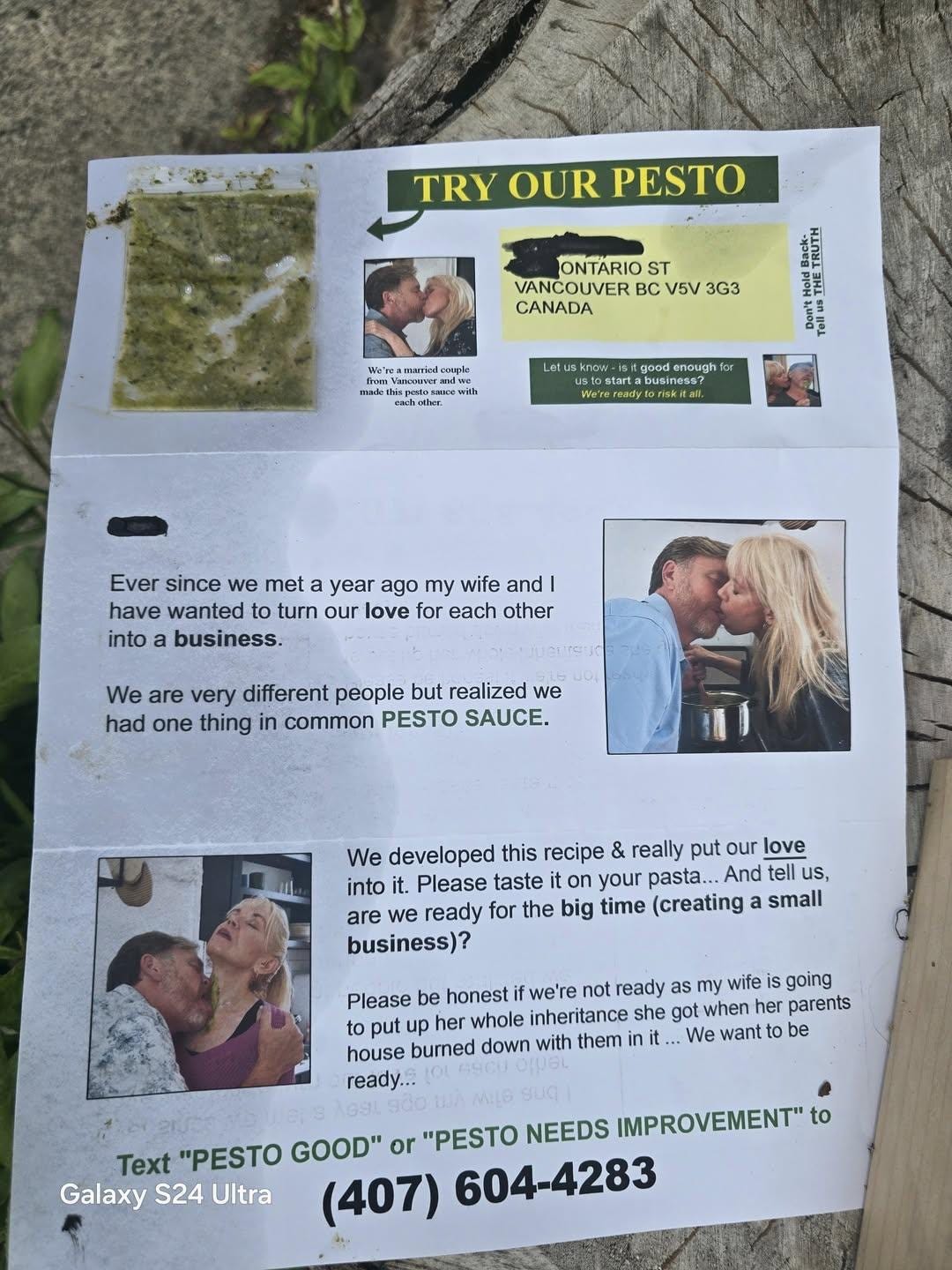 Yuck = Odd with no value. (Like this pesto ad being mailed around in Canada: a random couple kissing while asking people to fund their pesto dream with “her dead parents’ inheritance.”) Absolutely diabolical. Nobody asked for that level of detail. Nobody.